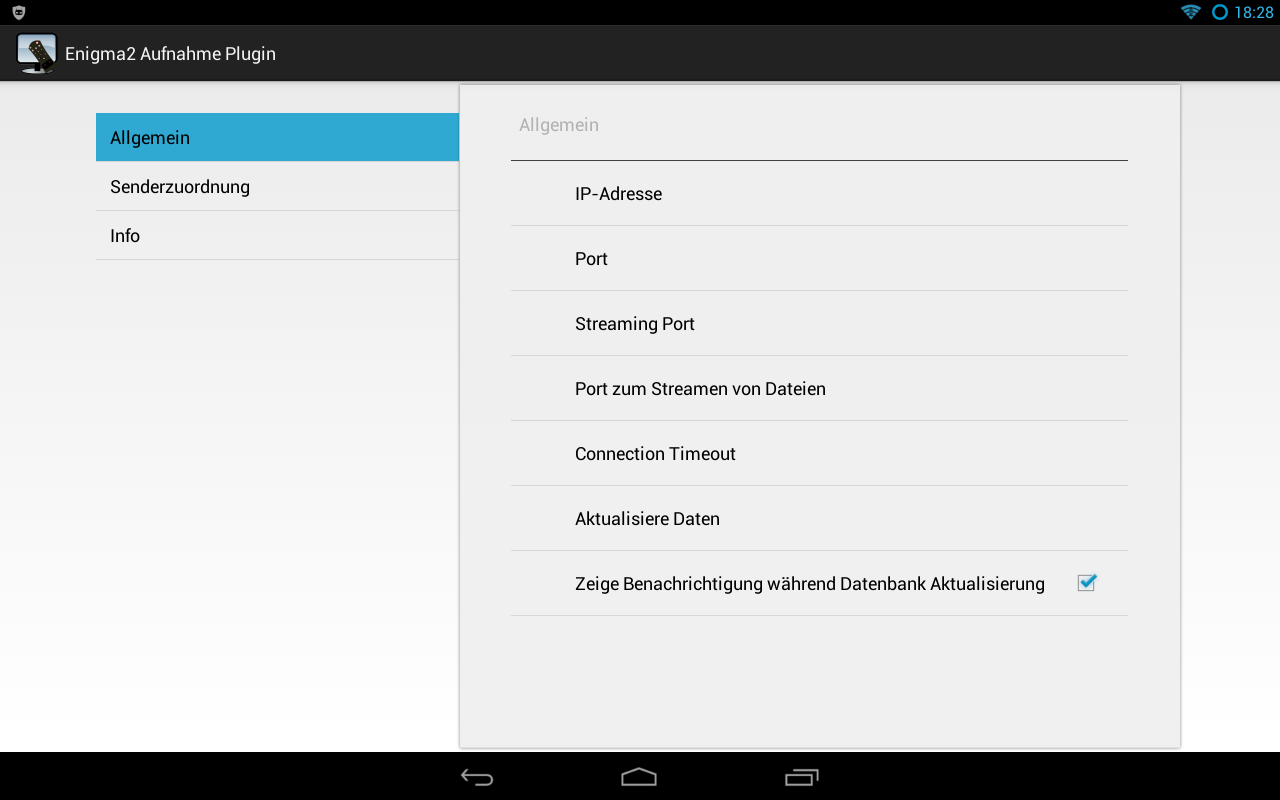 플러그인 및 TV-브라우저를 열고 TV-브라우저의 수단을 설치 한 후. 설정을 엽니 설정 -> 플러그인 설정 -> 플러그인 Enigma2 이미지 -> 열기를 설정합니다. 이제 버튼 "추가 프로필"새 프로필을 만들 수 있습니다. "연결"버튼을 클릭 한 다음 프로필을 누르고. 이제 수신기의 연결 데이터 (IP 주소, 포트 등)를 입력한다. 장치의 뒤로 버튼을 누릅니다. 이제 TV-브라우저 및 수신기의 송신기의 할당을 확인, 역 할당을 사용할 수 있습니다. 채널을 변경하려면, 당신은 그를 터치해야합니다.