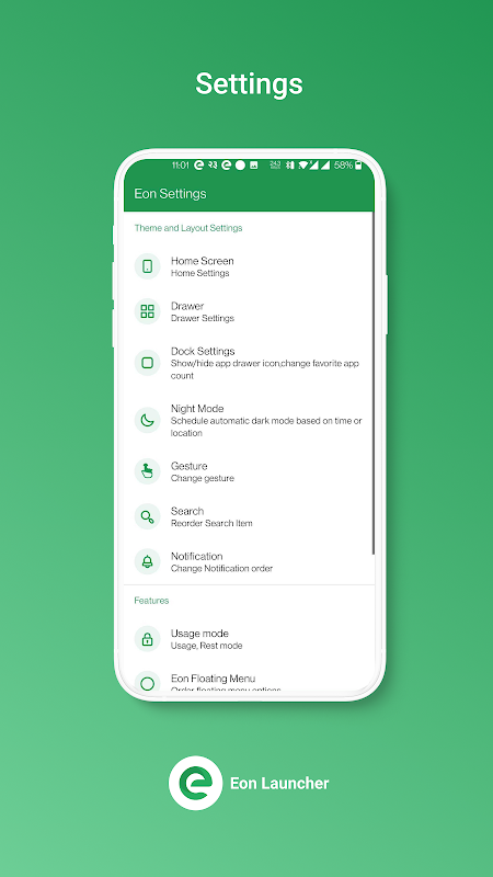 - Eon 런처는 사용자에게 즐겨찾기에 맞게 메뉴를 사용자 정의할 수 있는 옵션을 제공합니다.