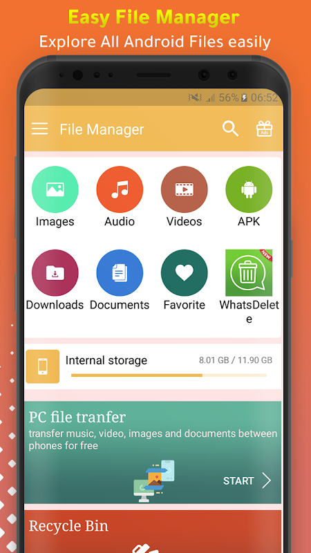 File Manager is a powerful app with a clean and intuitive interface. With this file manager app, you can quickly browse and manage the files on your mobile device, PC, and cloud storage, just like you use Windows Explorer or Finder on your PC or Mac. Also it provides a rich set of features that advanced users are looking for without feeling bloated. You can even manage the space used on your mobile device with a visualized storage analysis.
