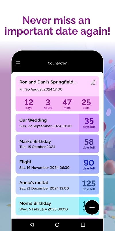 필수 카운트다운 캘린더 앱을 사용하면 필요에 맞게 카운트다운을 맞춤 설정할 수 있어 그 어느 때보다 쉽게 일정을 정리하고 관리할 수 있습니다. 지금 다운로드하고 특별한 순간을 카운트다운해 보세요!