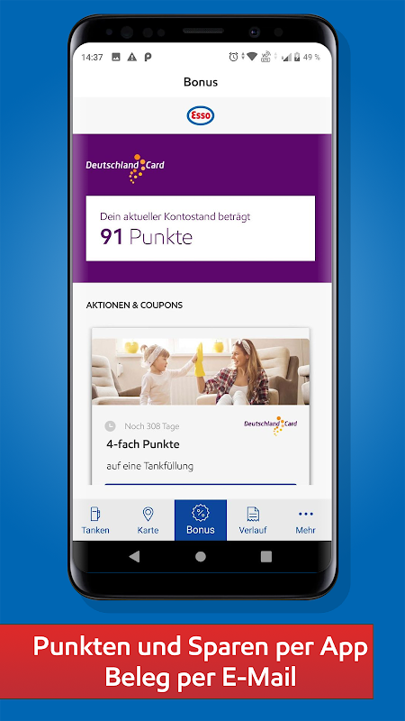 이제 Esso에서 휴대폰을 사용하여 연료를 지불 할 수 있습니다. DeutschlandCard 보너스 프로그램을 사용하여 연료 절약 비용을 빠르고 안전하게 지불하십시오.