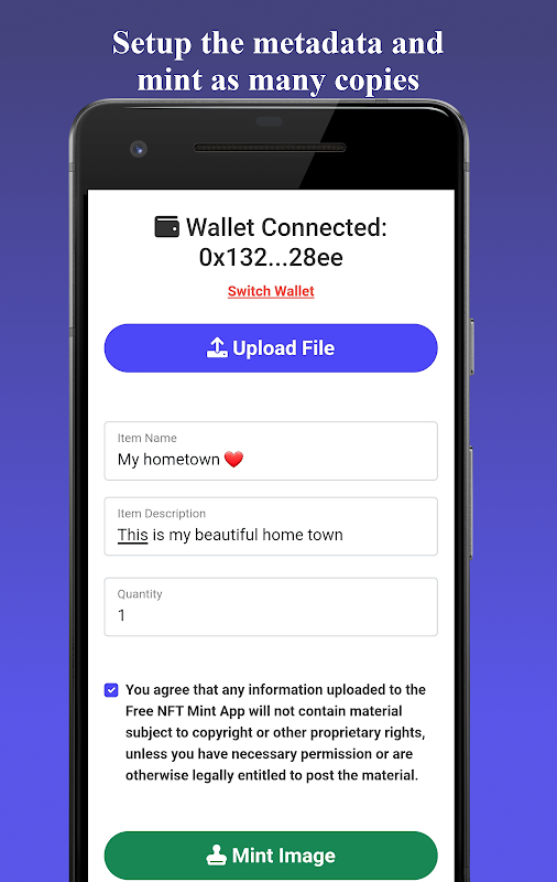 Enter the quantity of the image to mint. You can multiple copies of the same NFT that you can own, sell, or transfer