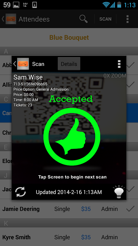 This app will work in conjunction with our ticketing system QR codes, via the add-on we released earlier this year, by scanning the codes at the door to check in attendees.