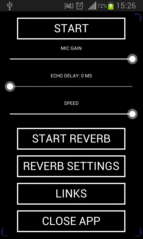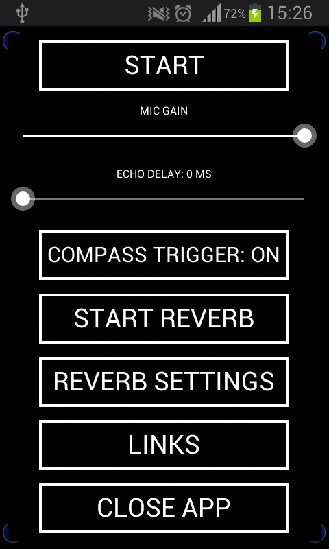 "MENU" - opens app settings. Set delay time, reverb, speed, mic gain and access compass toggle etc. Start there.