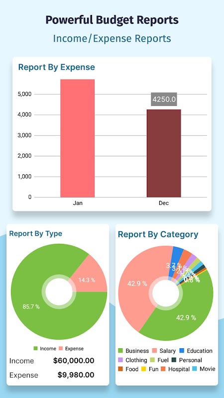 범주, 거래 유형, 수입과 지출을 기준으로 한 상세한 차트와 보고서를 통해 통찰력을 얻고 현명한 결정을 내릴 수 있습니다.