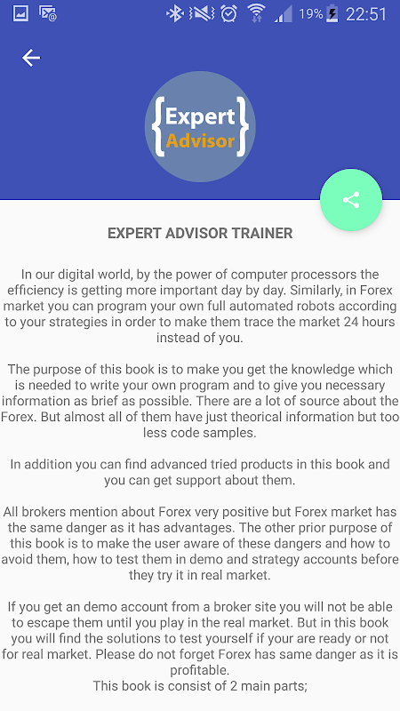 The purpose of this book is to make you get the knowledge which is needed to write your own program and to give you necessary information as brief as possible. There are a lot of source about the Forex. But almost all of them have just theorical information but too less code samples.
