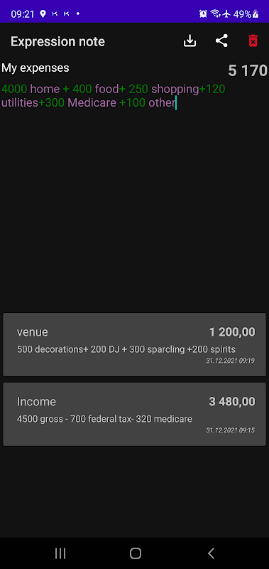 You can write a mathematical expression in a line as you like, with your own notes. The result is calculated immediately. You can save and edit calculations, use in other calculations (long press). This can be used for budget calculations, financial planning and so on.