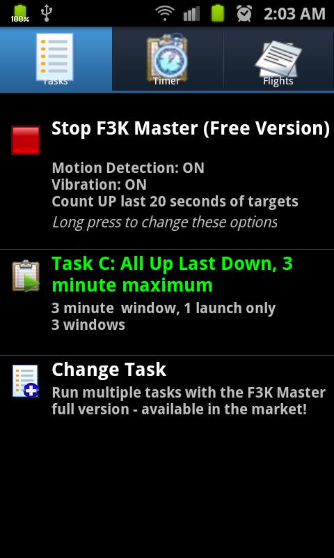 사용 가능한 공식 F3K 작업, 특수 사례 작업에서 선택하거나 자신을 구성합니다. 그들이 작업을 통해 변화에 따라 항공편, 창 및 목표 시간 타이머 디스플레이와를 호출합니다. 당신이 작업을 진행하면서 필요한 대상 시간이 조정됩니다.