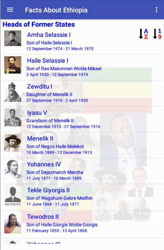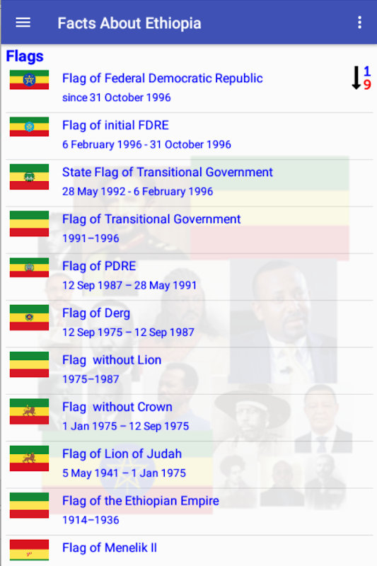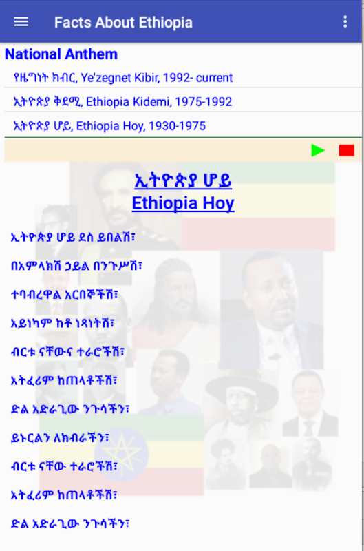 Heads of Former States that include Presidents and Prime Ministers of Ethiopia in the past will be displayed using this App. Emperors, Flags and Anthem used in past times are also part of this App.