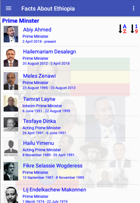 이 응용 프로그램은 이전 주인의 머리를 보여주기 위해 설계되었습니다; 과거에는 에티오피아의 총리, 대통령 및 황제. 사진과 날짜가 포함되어 있습니다. 또한, 다른 시간에 사용되는 플래그와 세 개의 국가가 포함되어 있습니다. 또한 세 개의 Anthem을들을 수 있습니다.