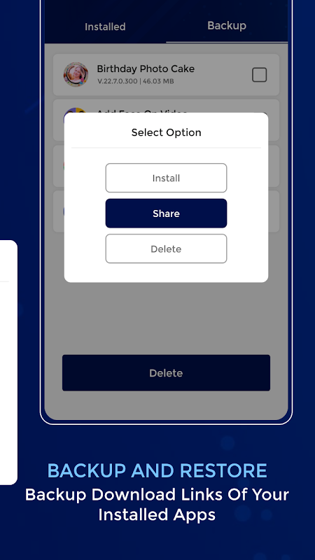 앱 백업 및 복원에서 앱의 APK 파일을 로컬 저장소에 백업할 수 있습니다. 앱을 복원하는 동안 선택한 모든 앱이 자동으로 다시 설치됩니다. 앱의 크기를 확인하고, 친구들과 APK를 공유하고, 앱을 제거하고, 앱을 실행하고, 앱을 백업할 수도 있습니다. 앱을 백업하면 앱을 제거하는 경우 데이터 요금과 사용량이 절약되며 백업 파일에서 다시 설치할 수 있습니다.