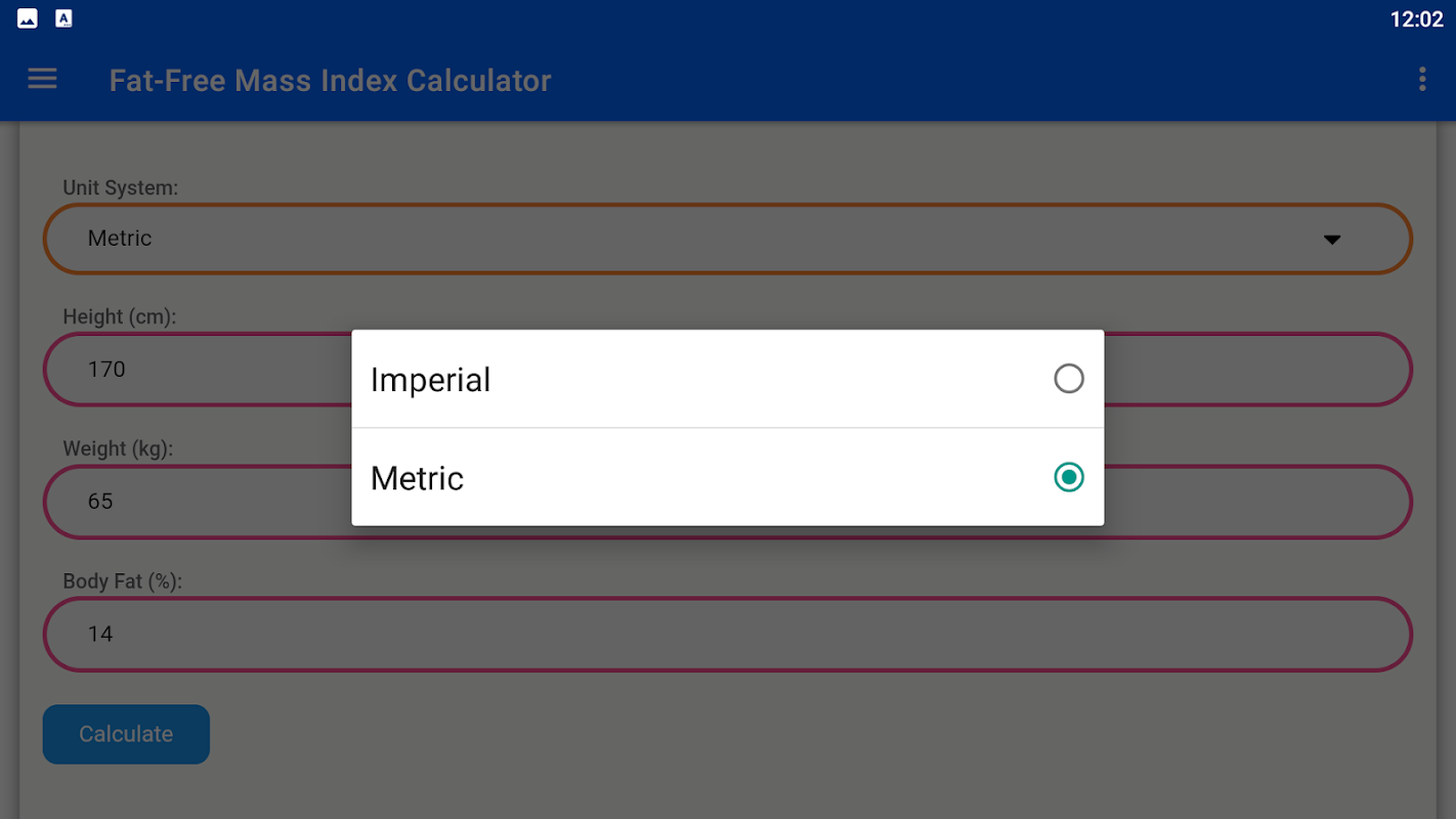 앱에는 영국식 또는 미터법과 같은 두 가지 측정 시스템이 있습니다. 체지방 비율, 체중 및 키를 입력하기만 하면 됩니다. 그리고 알고