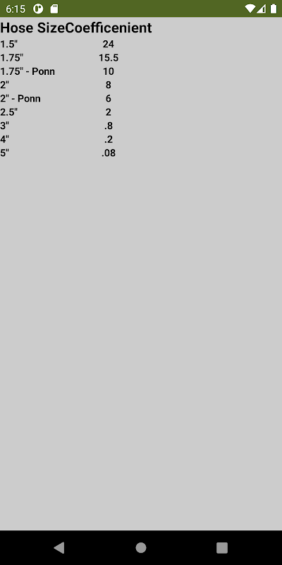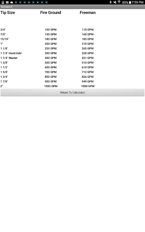 마찰 손실 계산기, 필요한 화재 흐름, 유조선 셔틀/농촌 물 및 펌프 배출 압력 계산기. 사용자는 주어진 호스 길이의 마찰 손실량을 찾기 위해 각 텍스트 상자에 숫자 값을 입력할 수 있습니다. 이 앱에서는 최신 호스와 계수를 수용하기 위해 어떤 숫자든 사용할 수 있습니다. 각 팁 크기에 대한 일반적인 팁 크기 및 분당 갤런과 함께 일반적인 호스 계수에 대한 앱과 함께 두 개의 참조 페이지를 제공했습니다.