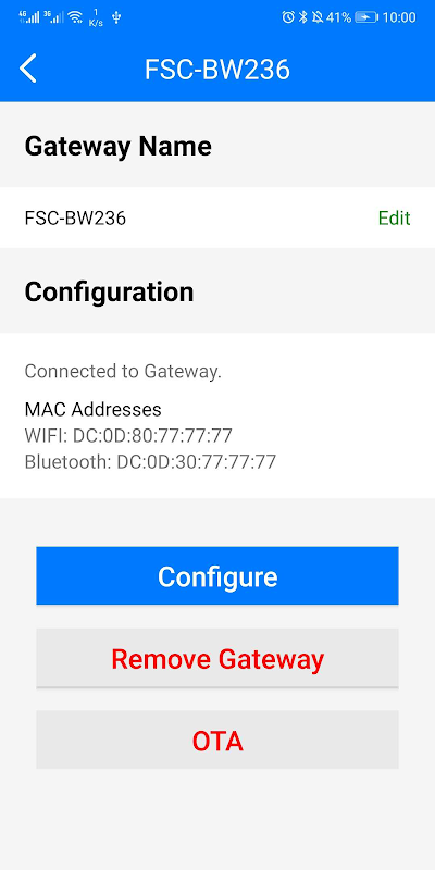 A beacon APP for Feitong temperature, humidity, gateway, APP Sensor page mainly displays the current device name, mac address, temperature, humidity, power, signal strength, and can view historical data through line chart; Gateway page Display the added gateway device, display name, mac address, signal strength, and add and edit gateway through Bluetooth scanning.
