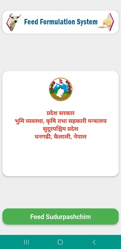 Feed Sudurpashchim은 네팔 Sudurpashchim 주 토지 관리, 농업 및 협동 조합에 의해 개발 된 모바일 앱입니다. 이 모바일 앱은 쉽게 다른 재료를 사용하여 사료를 공식화하는 시스템을 통합합니다. 이 앱은 주로 복잡한 사료 배합 과정을 동물 영양에 대한 지식이없는 사람들도 이해하고 사용할 수있는 간단한 용어로 쉽게 만드는 것을 목표로합니다. 이 모바일 앱은 정부 축산 확장 근로자가 지역 수준의 농가에게 사료 배합을 쉽게 제안 할 수 있도록 설계되었습니다.