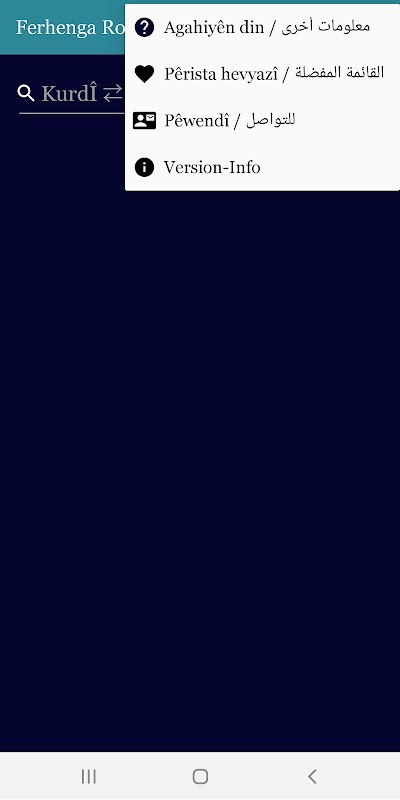 이 응용 프로그램은 응용 프로그램 내에서 단어의 컬렉션 아닌 개별 작품의 제품이 아닙니다, 그것은 결과적으로 많은 소스에 기반하고 자신이이 개 사회 쿠르드어 사이에 자신의 봉사 활동을 통해 표현 연구도 인쇄 된 책 사전 계몽 방언 쿠르 만 지어 작가 사이프 알 - 딘 아브 (Chorazad)에서이다 그리고 아라비아 인, 그의 노력 덕분입니다. 나도 일부러 당신에게 사용하기 쉽고 더 도움이 될하기 위해 응용 프로그램을 소개했다.