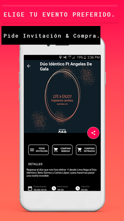 Descubre Eventos. Pide invitaciones. Asiste. Usar Fever es fácil: simplemente navega en el mapa de discotecas, usa los filtros del mapa para encontrar las discotecas de todo el Perú, para ver su información o dar un feedback realizando un comentario o calificando con un nivel de estrellas, también navega por el listado de eventos, usa los filtros para encontrar lo que buscas, además selecciona uno para ver su información disponible y para poder chatear con los promotores y solicitar una invitación mediante el chat. Cuando el promotor te da la invitación, ¡ya estas en la lista de invitados!. Sin otros medios. Sin estrés. Solo tienes que seleccionar los eventos que te interesan, chatear online con los promotores, dejar el móvil a un lado para luego asistir y crear nuevas experiencias conociendo nuevas personas y divirtiéndote.