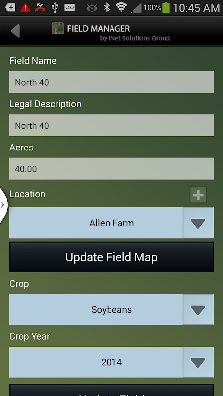 The Field Manager is a free tool developed for grain farmers that allows them to manage their field-level information. Field Manager lets the user easily create fields, set information, and track their activity throughtout the year.