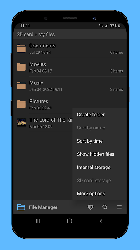 파일 관리자를 사용하면 장치 및 SD 카드의 파일 및 폴더를 관리하고 검색할 수 있습니다.