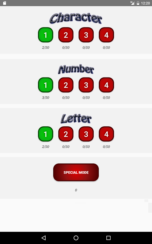 이 게임은 4 단계로 구성되어 있습니다. (문자, 숫자, 문자 및 특수 모드)