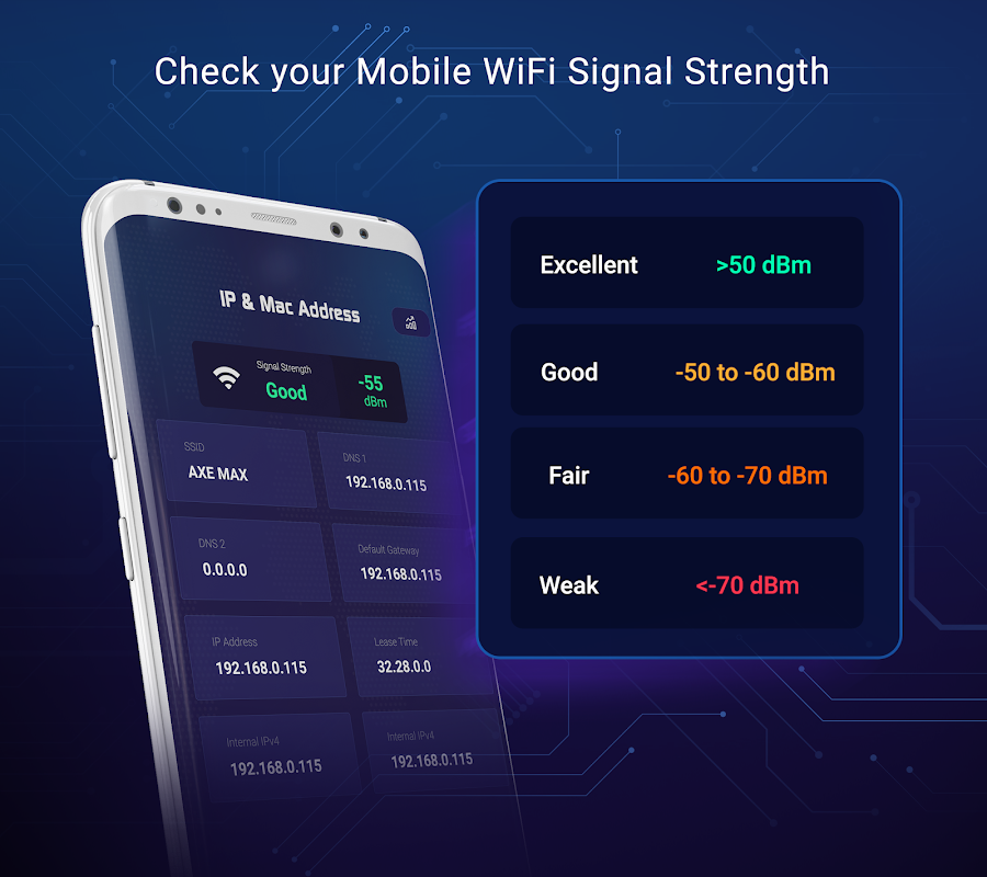이 앱은 장치의 IP 주소 및 MAC 주소 정보와 WiFi 연결의 WiFi 신호 강도를 제공합니다. 이 응용 프로그램의 도움으로 다음 정보를 얻습니다.