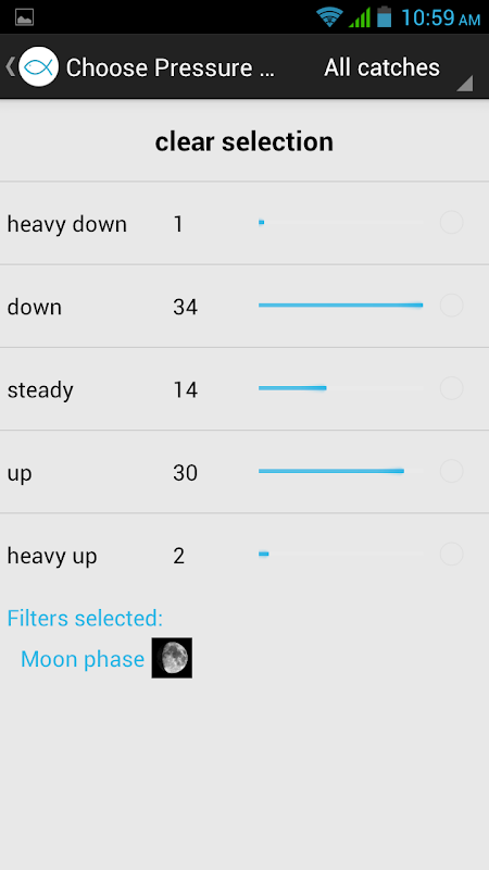 NEW 1st of July 2013! Now includes Analyze. Analyze your catches easily with four different filters. Moon Phase, relative barometric pressure, barometric pressure going up/down and time of day.