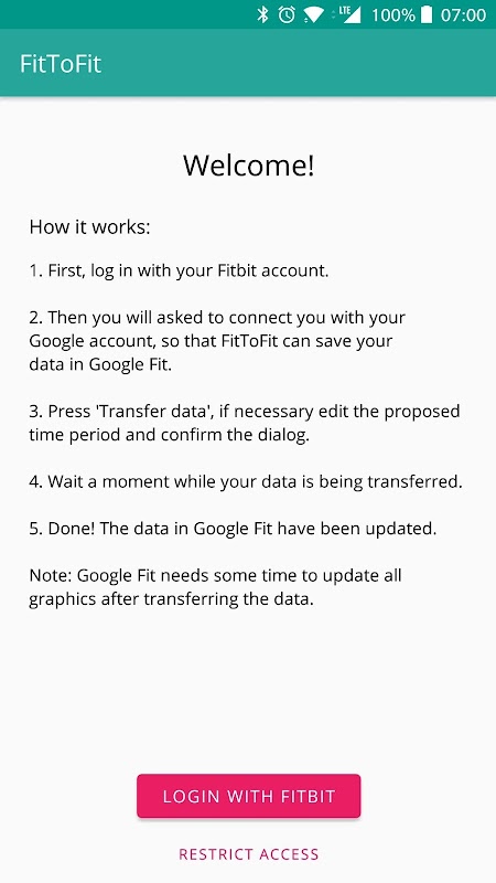 FitToFit을 사용하면 Fitbit에서 Google Fit으로 피트니스 데이터를 전송할 수 있습니다. 데이터는 Fitbit 계정에서 직접 쿼리되어 Google Fit에 삽입됩니다. 이렇게 하려면 먼저 Fitbit 계정으로 로그인하고 FitToFit에 전송하려는 데이터에 대한 액세스 권한을 부여해야 합니다. 그런 다음 Fitbit의 데이터를 삽입해야 하는 Google 계정에 연결하라는 메시지가 표시됩니다. FitToFit은 Fitbit에서 Google Fit으로의 전송에만 액세스 및 귀하의 데이터를 사용합니다. 귀하의 데이터는 Fitbit 및 Google Fit 외부에 저장되지 않습니다.