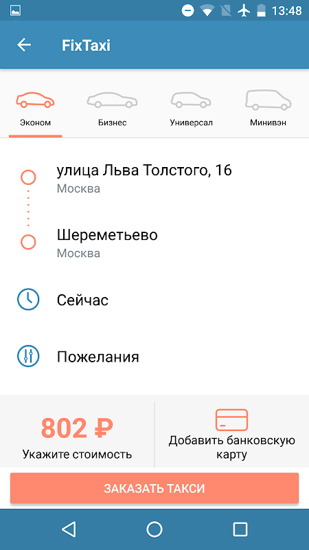 Вы сами назначаете цену, за которую готовы уехать, а Фикс Такси (ранее Аэротакси) ищет исполнителей заказа среди таксистов.
