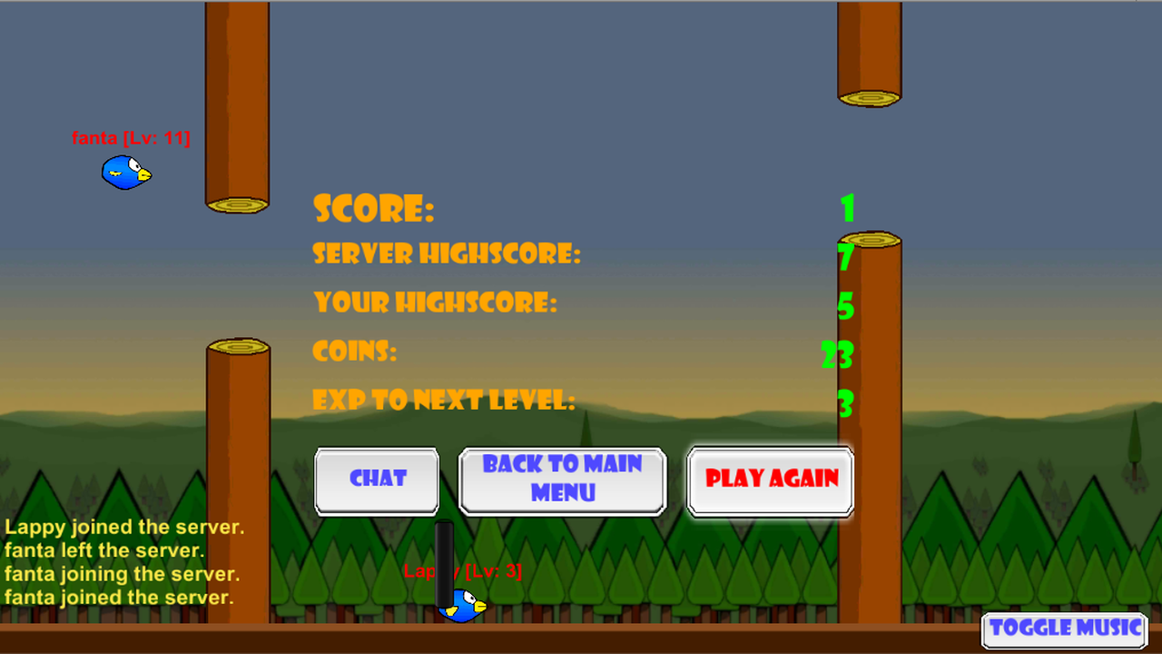 Flapping Crew ist ein Online Multiplayer Spiel und ermöglicht das Spielen mit Freunden auf einem Server mit wählbaren Charakteren/Skins. Du bist in einem Wald und versucht, während du fliegst die Baumstämme auszuweichen. Tippe um Höhe zu gewinnen oder du wirst runterfallen. Behalte den Highscore im Auge oder breche den Server-Highscore. Spiele länger und verdiene mehr Erfahrungspunkte, um Levels aufzusteigen. Nehme den ersten schlenkrigen Charakter/Skin, verdiene Spielmünzen und schalte damit neue Charaktere/Skins frei. Zum Beispiel den Zeppelin.