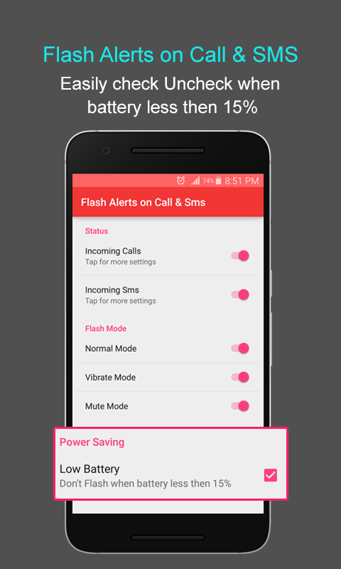 flash call 2017/flashlight alerts app have battery saver mode , when your device battery is less than 15% your phone flash will never blink .