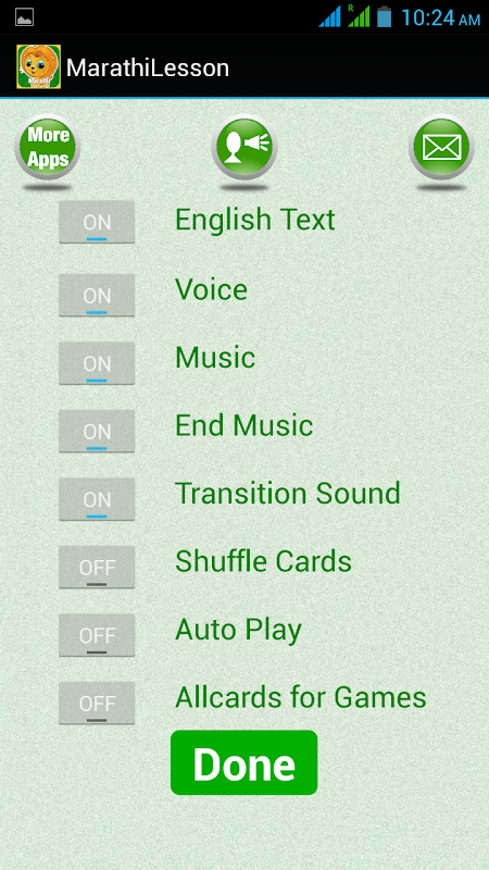 This app helps new language learner (kids to adults) to learn Marathi words in easiest way, builds vocabulary and pronunciation of basic words in categories like Alphabet, Numbers, Body Parts, Birds, Animals, Vegetables, Fruits, Colors, Shapes, and Calendar. Key feature includes,