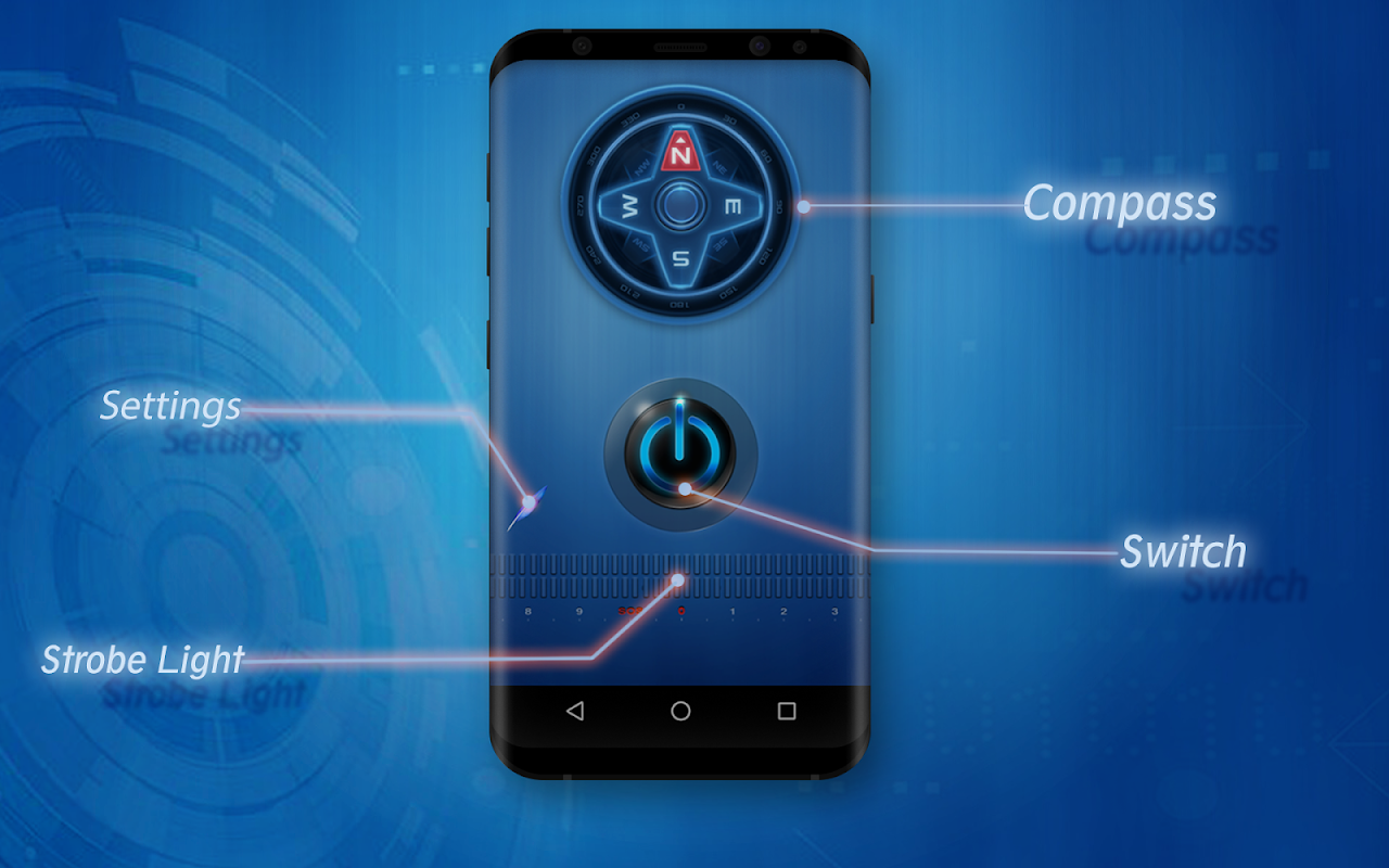 Flash 무료 손전등 및 나침반, 빠르고 깨끗하고, 공상 및 소형.