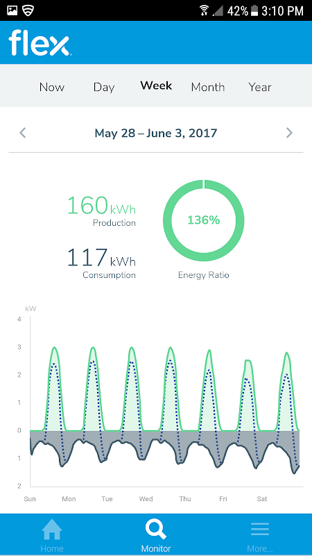 Enjoy access to your Flex Energy Hub to view solar energy production and manage home consumption. Solar production and home consumption are provided in convenient formats of now, day, week, month, and year to spot and manage trends.