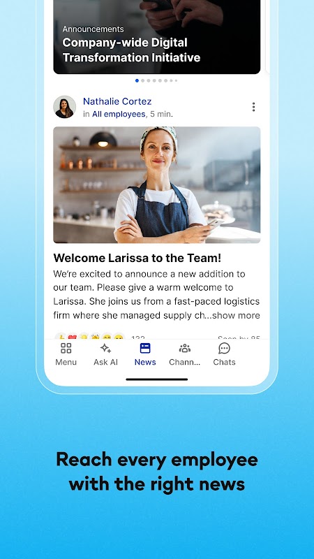 위치, 팀, 직무별로 맞춤 설정된 회사 뉴스, 실시간 이벤트, 설문조사를 제공합니다.