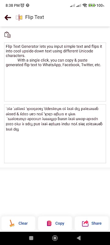 결과를 즉시 확인하세요! 뒤집어! 반복하세요! Fun을 사용하면 변환된 텍스트를 복사하거나 공유하기 전에 미리 볼 수 있습니다.