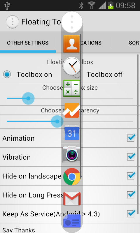 - Add applications to Floating Toolbox by long pressing the Floating icon or press the launcher icon.
