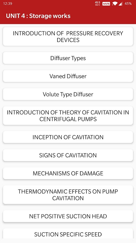 앱에는 점도, 원심 펌프, 유체의 속성, 유체 역학, 터빈, 유압 터빈, 유체 커플링, 원심 펌프, 펌프 설치 및 원심 펌프와 같은 몇 가지 중요한 주제가 있습니다.