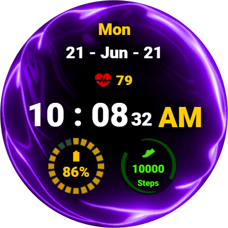유동적인 애니메이션 테마가 있는 Wear OS용 간단한 디지털 시계 모드. 시계 페이스를 한 눈에 보면 중요한 정보(날짜, 시간, 심박수, 걸음 수, 배터리 퍼센트)를 확인할 수 있습니다. 애니메이션 배경은 다른 사람들과 차별화되는 멋진 효과를 만듭니다. 또한 배터리 표시등의 색상이 배터리 백분율에 따라 변경되므로 세부 사항에 집중하지 않고도 배터리 잔량이 어디에 있는지 즉시 알 수 있습니다. 마찬가지로, 일일 목표에 도달하면 걸음 수가 녹색으로 켜집니다. 놀랍지만 배터리 친화적이지 않습니다. 12시간 및 24시간 형식의 항상 표시 모드를 지원합니다.