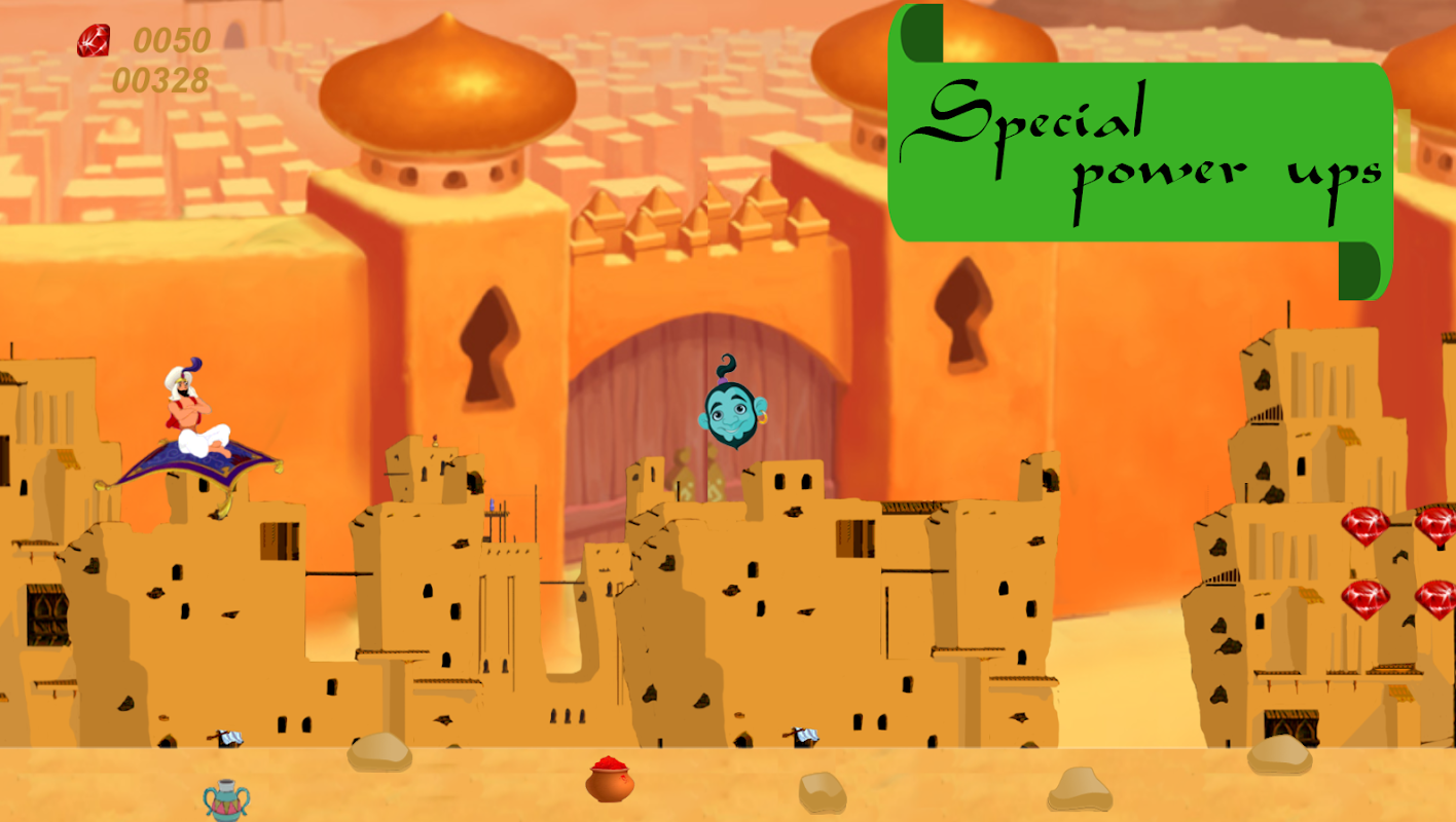 Your wonder carpet can’t protect you from swords & maces, but the genie can. His your protector! Every time you collect a genie token, you can rest assured you’ll be safe from any danger for a period of time. The token will turn into blue sparks that will surround you and the magic carpet and it will keep you safe from any potential threat- now, doesn’t it make you feel like a sheik?!