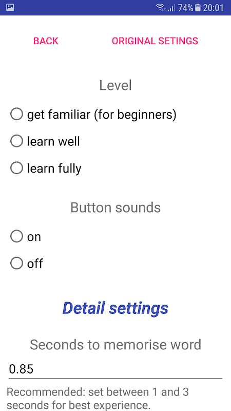 App makes you focus on learning most common words of language. Where is ~1500 most common words. You can choose from few popular languages to learn - English, Spanish, Italian, German, Russian, French. You can also make your own list of word of any language, publish it on internet and upload to the app. Depending on your device app can synthesize speech from given word in many languages (Text to speech). You can also use this app for learning list of capitals and countries or other similar lists.