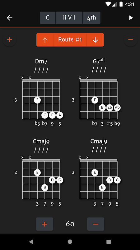 응용 프로그램은 진행을 재생할 수 있으며 메트로놈과 함께 선택한 변형입니다. 메트로놈의 속도를 설정하고 연주 코드 / 다이어그램이 강조 표시되면 따라갈 수 있습니다.