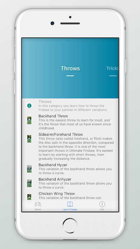 우리는 프리스비를 다루는 방법에 대한 지침과 함께 멋진 게임을 만들었습니다. 프리스타일 프리스비의 유럽 챔피언이 여러분에게 다양한 던지기 기술과 트릭을 배울 수 있도록 안내합니다.