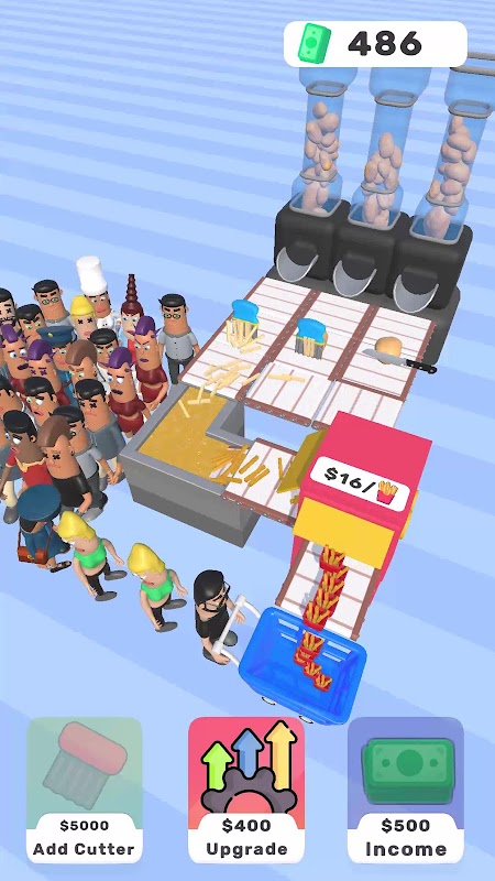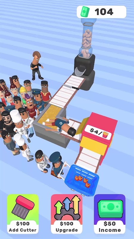 튀김 절단기를 업그레이드하고 생산 라인을 자동화하여 바삭하고 황금빛 감자튀김을 쉽게 만드세요. 게임을 진행하면서 기본 모델부터 고급 모델까지 다양한 유형의 프라이 커터를 잠금 해제하고 업그레이드할 수 있습니다.