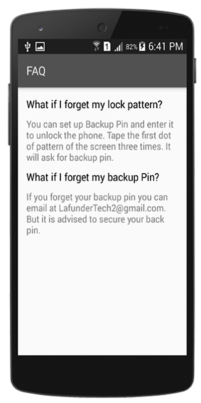 In case you forget your pin for full screen pattern lock. You can email me for the secret pattern which will reset everything. This option is added for security.