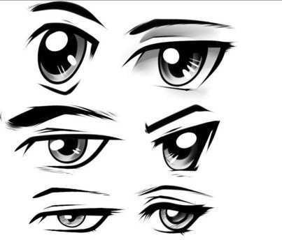 Drawing the hair is usually one of the traits that in the spot identifies a character as manga-style. When you're comfortable with these steps, move on to more complicated styles, and add shine to the hair in zigzag patterns. The eyes are said to be the windows to the soul. To draw the eye, you have to understand a few basics about it. Let’s start with the front view of the eye. The first example to the left shows the average eye in real life. It’s almond-shaped, has circular pupils, lashes above and below, and lines around the eye defining the eyeball.