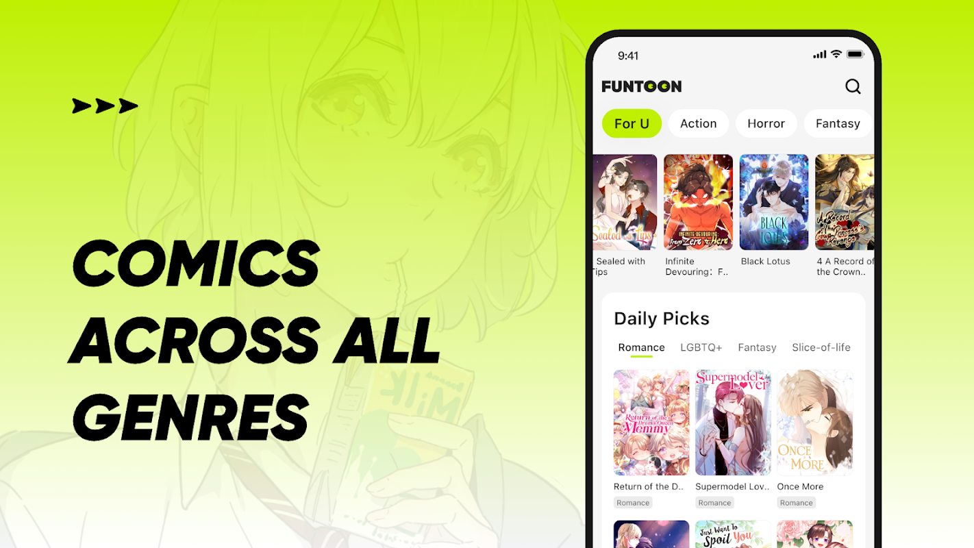 로맨스, 액션, 미스터리, 역사 로맨스, 삶의 단면, 미스틱 판타지, 판타지, SF, 코미디, 드라마, 스릴러, 야오이(BL) 등 FunToon의 다양한 장르를 탐험해보세요. 선택할 수 있는 다양한 옵션을 통해 FunToon은 귀하의 고유한 선호도를 충족시킵니다. 매혹적인 이야기에 빠져들고 FunToon에서 다음으로 좋아하는 만화를 찾아보세요!
