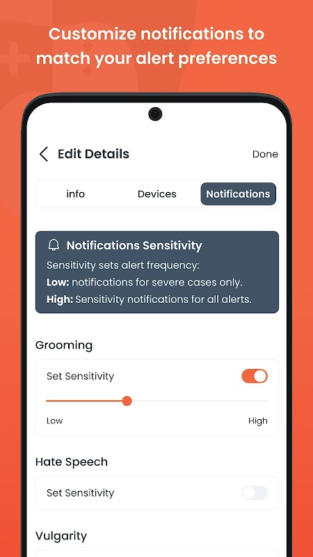 정신 건강: GameSafe는 우울증, 불안 및 공격성의 징후를 감시합니다. 대화 행동의 변화가 감지되는 즉시 알려드립니다.