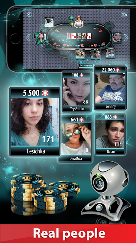 ♠ 친구와 함께하는 포커. 웹캠 테이블에서 플레이하고 실제 플레이어의 실제 감정을 감상하십시오.