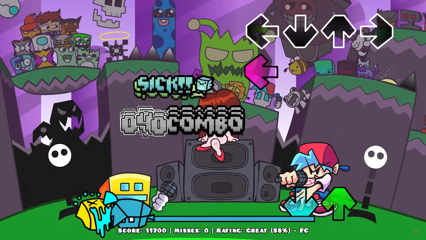 All you have to do is tap the arrows perfectly when they match with the FNF Geometry song to have the highest score possible and win the music battle in Geometry VS Funkin.