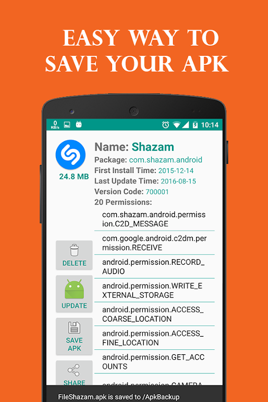 - WRITE_EXTERNAL_STORAGE: Save APK to SDCard.